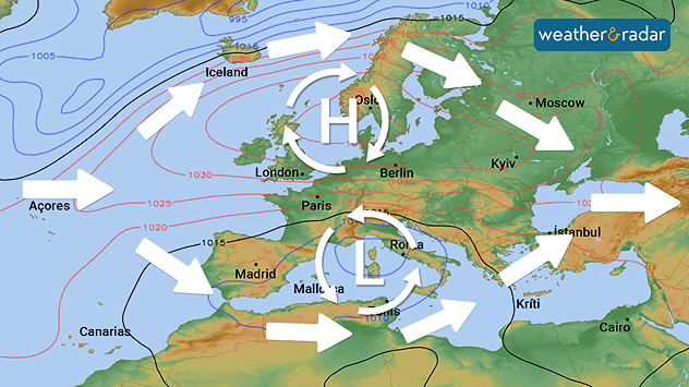 The general weather situation with a high in the north and a low in the south is called "high-over-low" and is one of the so-called blocking weather situations. In this case, the weather stalls for a while because the large-scale flow is directed around the two pressure systems.