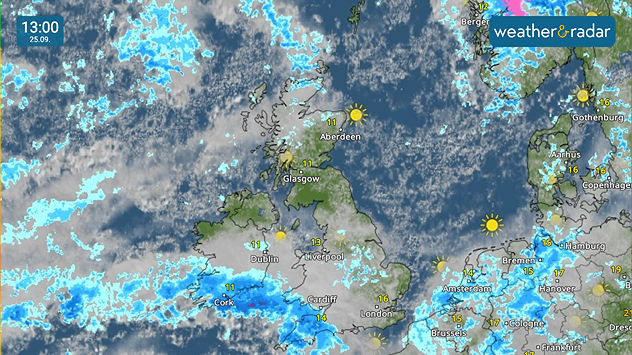 A low pressure system out to the south-west will slowly drive up through the day, bringing a heavy and persistent band of rain initially to Ireland, spreading into south-west England and Wales, continuing its track north-eastwards through the day.